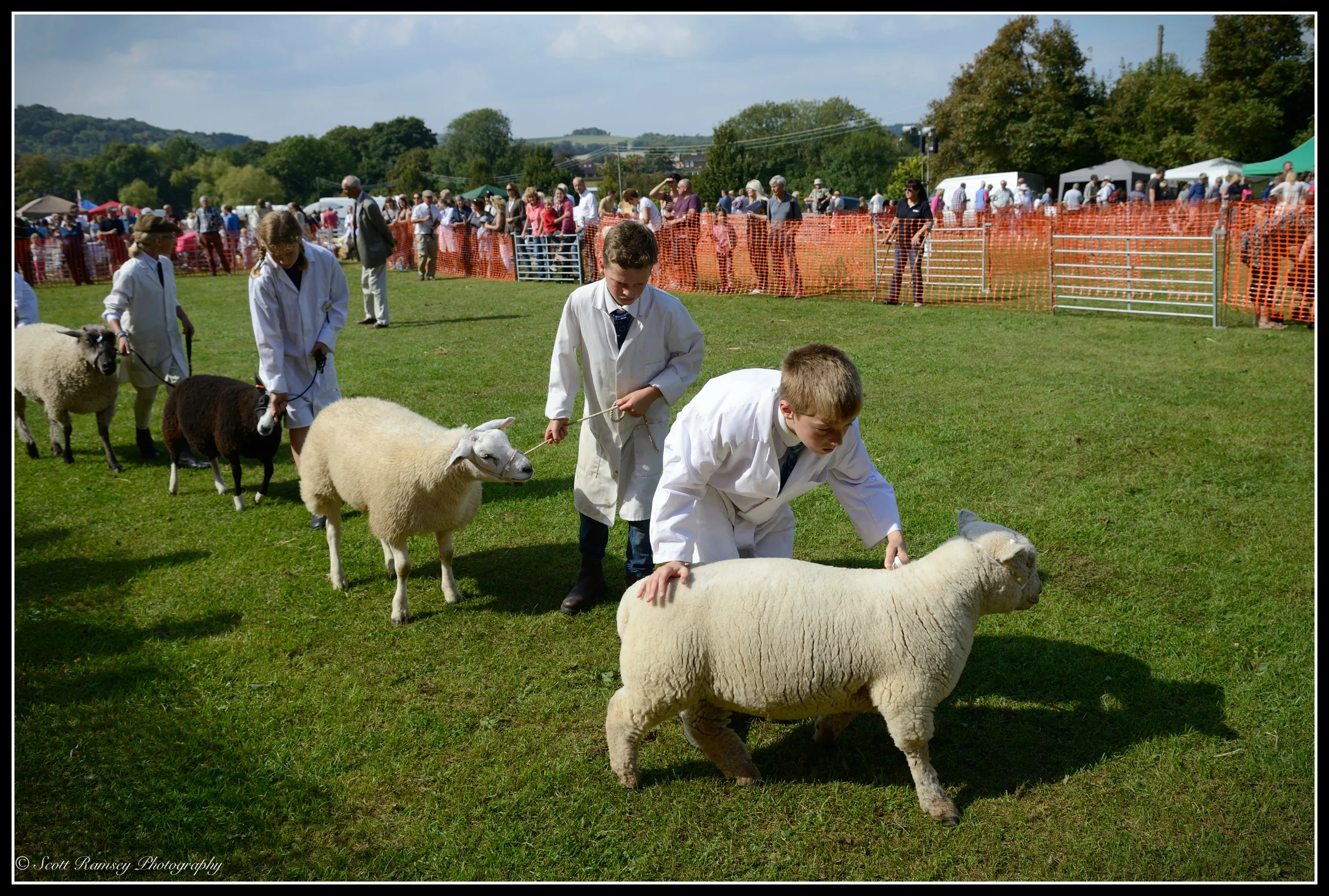 Findon Sheep Fair and Village Festival. The beautiful South Downs can be seen in the background of the photograph as competitors try to control their sheep whilst being judged in the main arena at the show.