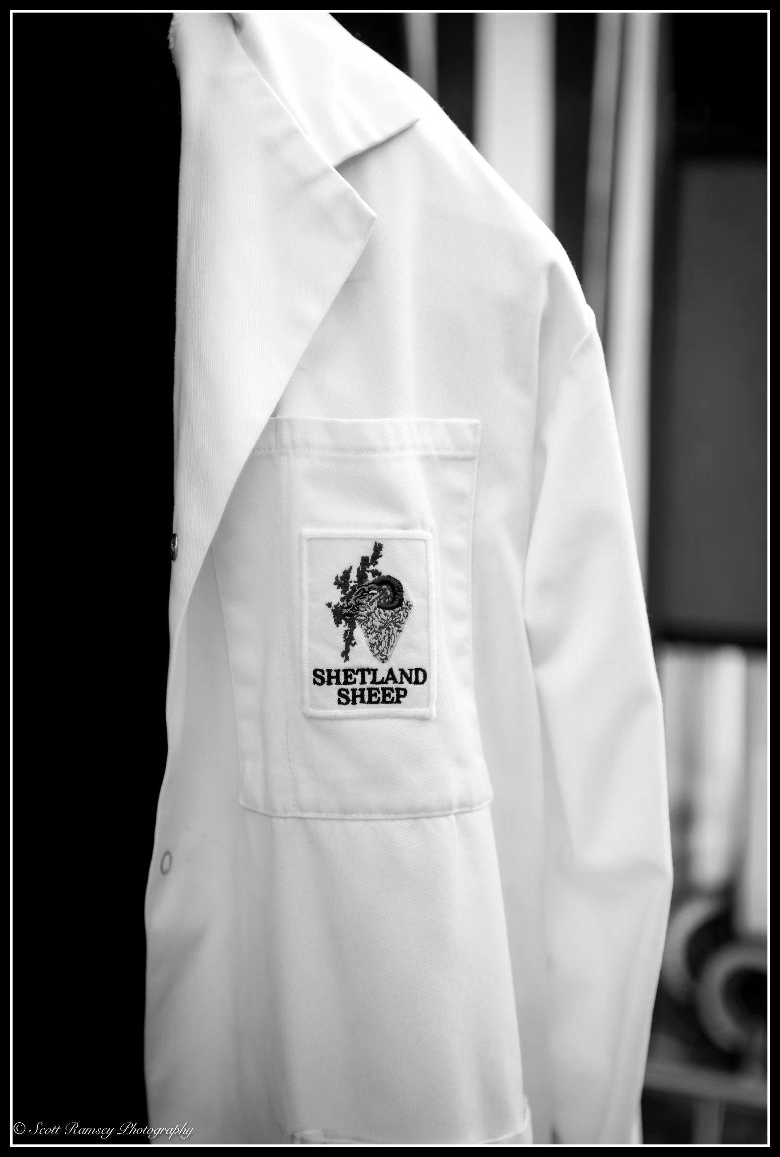 A white coat with a Shetland Sheep badge on it hanging up at the Findon Sheep Fair in West Sussex.
