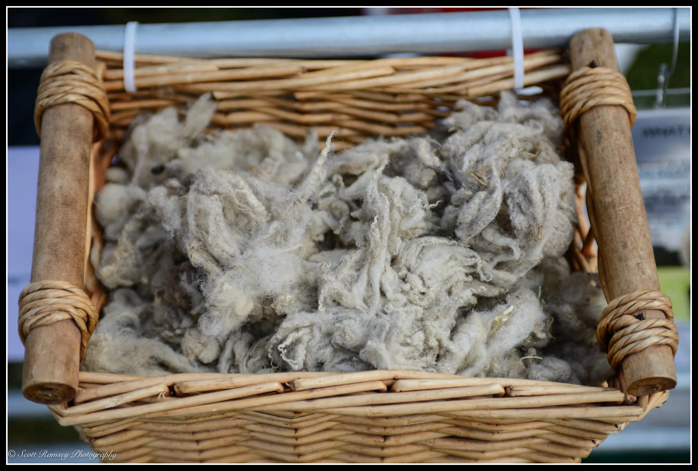 A basket containing sheeps fleece at the Findon Sheep Fair in West Sussex.
