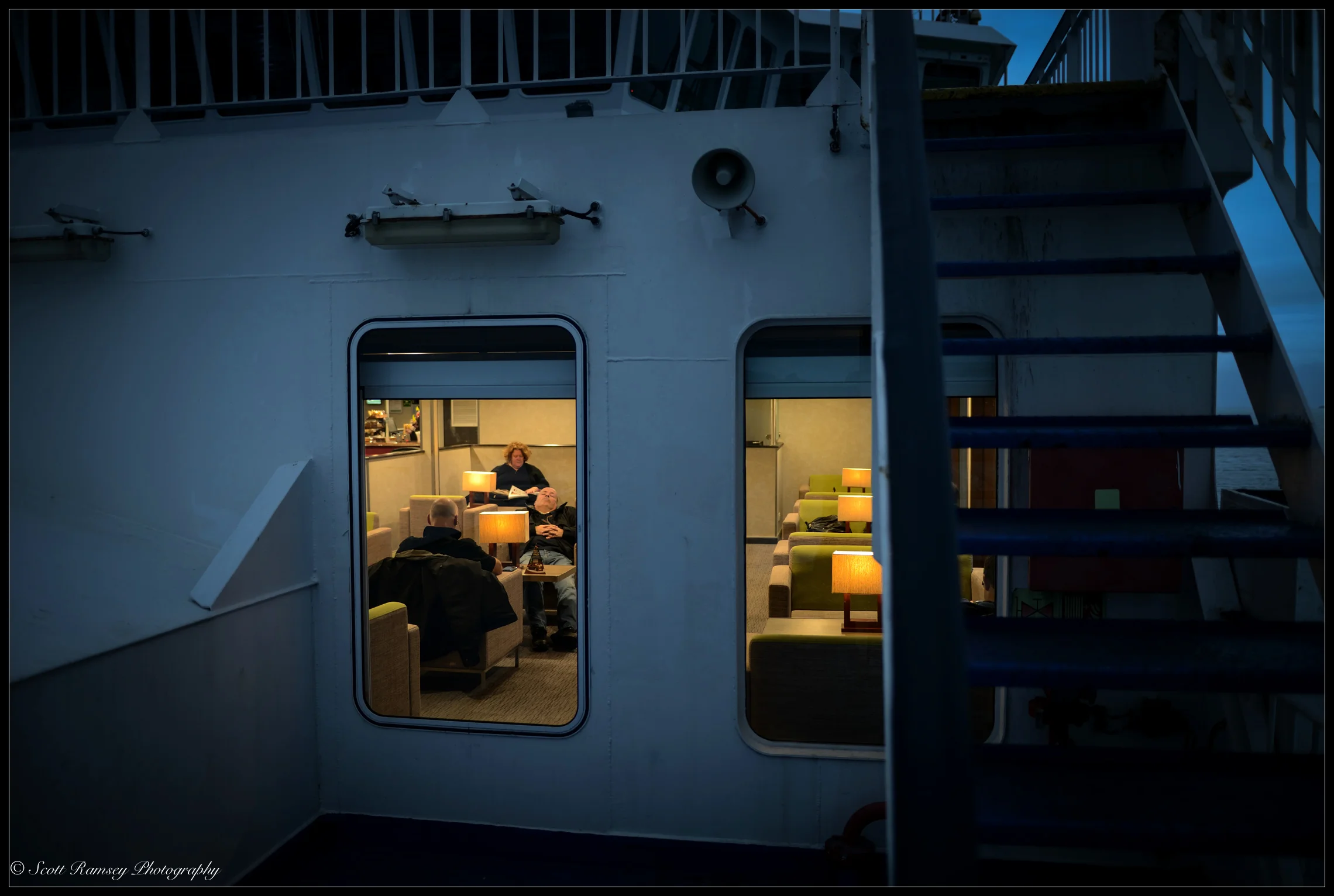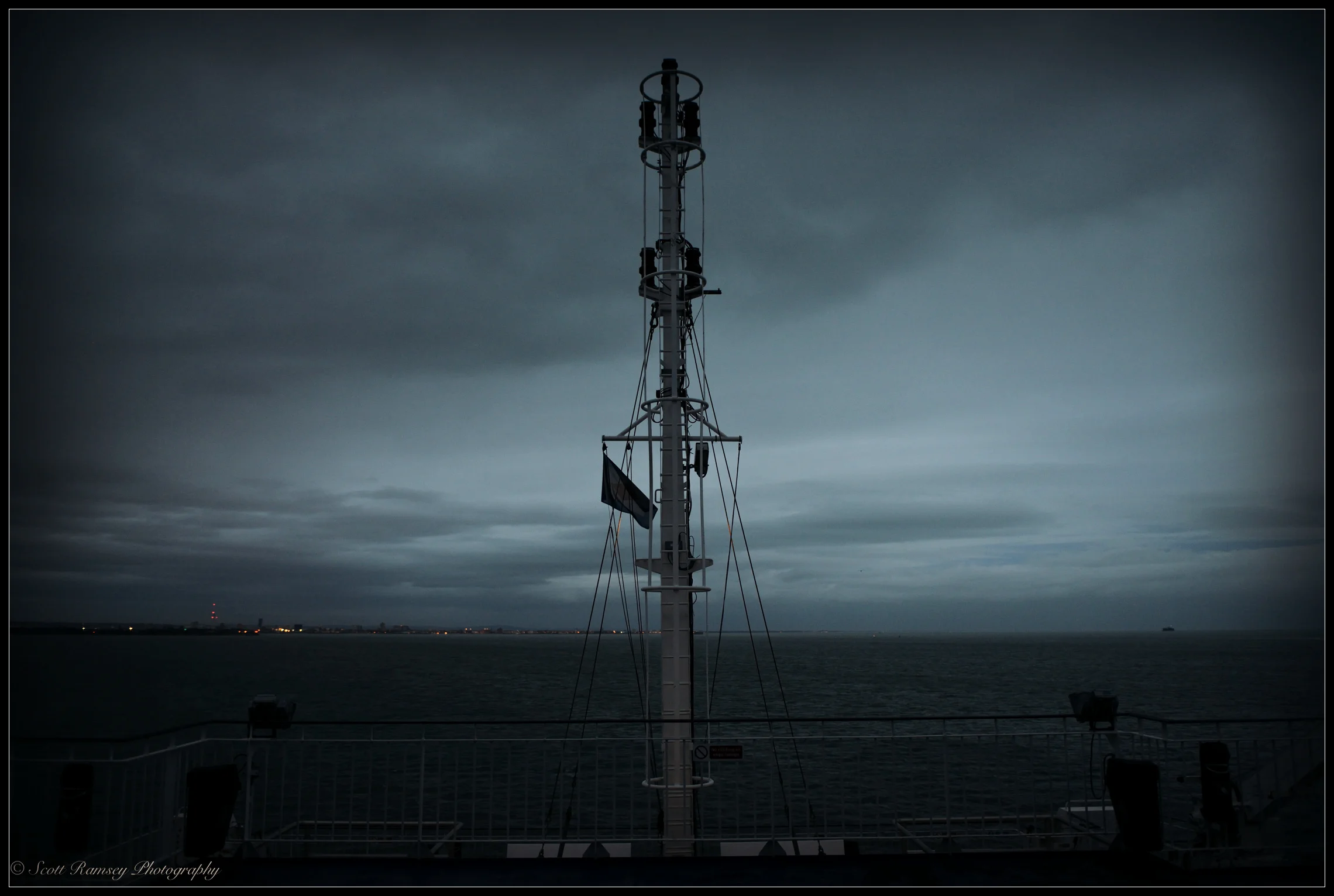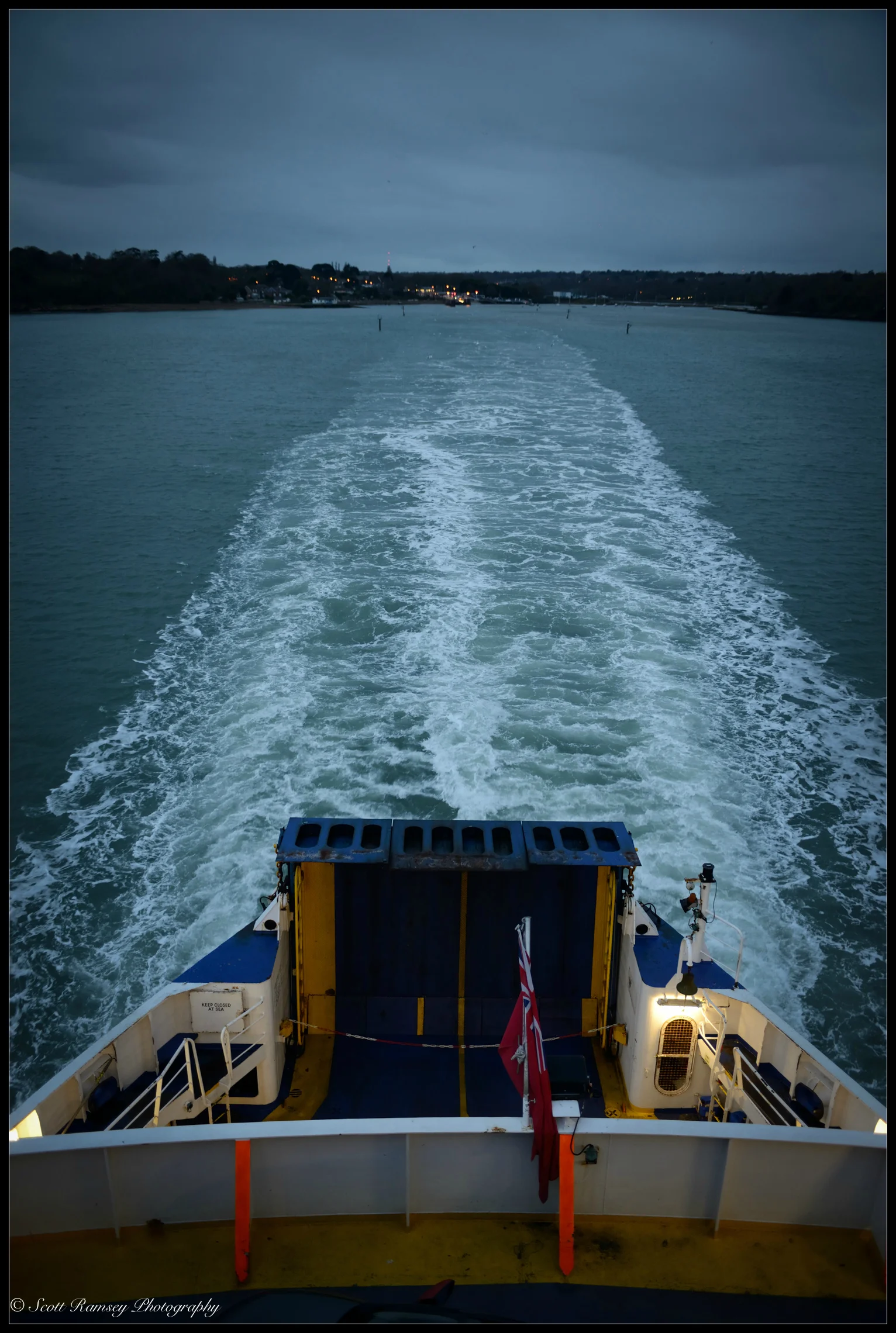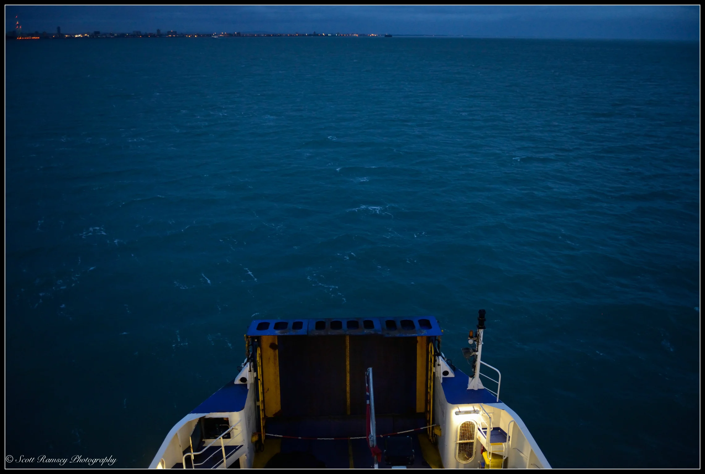 Late winter 2014 and after a photography shoot on the Isle Of Wight I grabbed my cameras and went top side of the Wightlink Ferry as it left the small village of Fishbourne. The light was fading fast and with night drawing in the other passengers soon settled down inside the large cabin with their warm cappuccinos. They must have thought me mad as I explored the deck of the ship stopping every now and again to take my photos. As the ferry sailed out to sea the darkness enveloped us like a cloak, that really dark slightly depressing blackness that only winter time allows, but as my eyes adjusted the light was actually amazing! It was very blue and had an eerie look and feel to it, very unexpected for a dark Decembers night! I had spent all day taking photographs and although tired the light re-energised me as I took my photographs and created a story of my return trip.