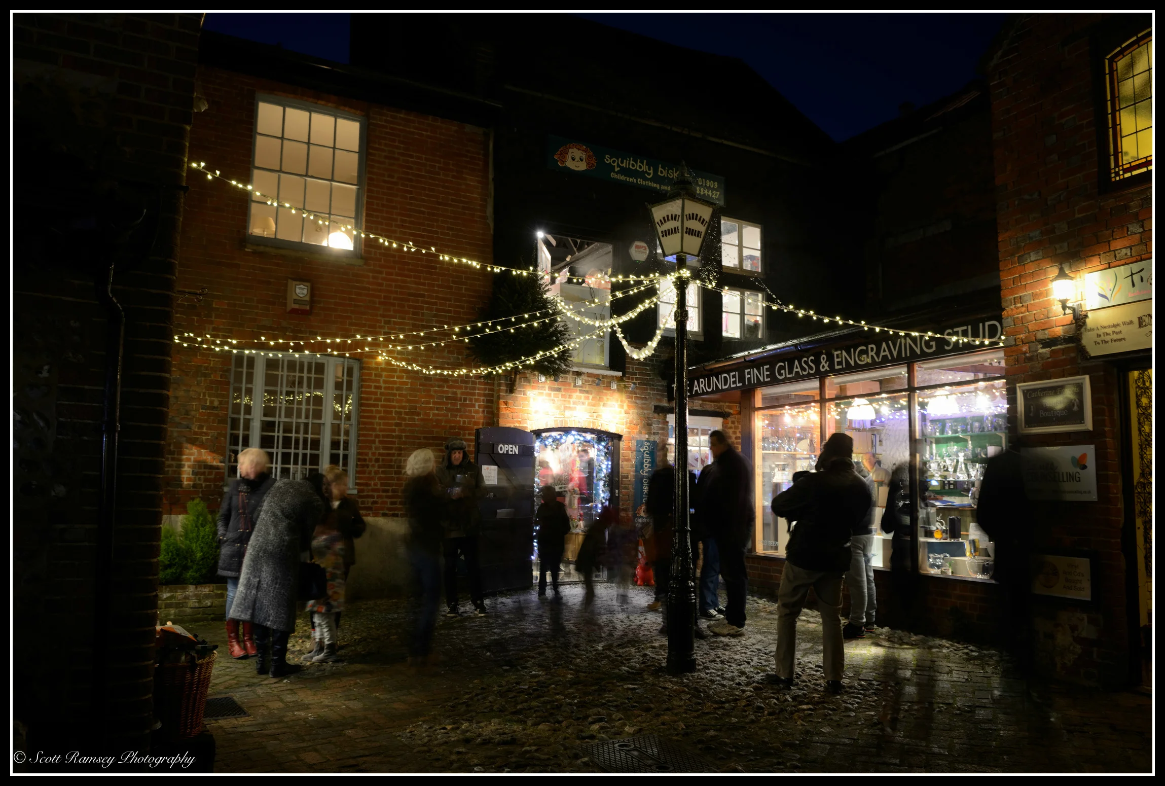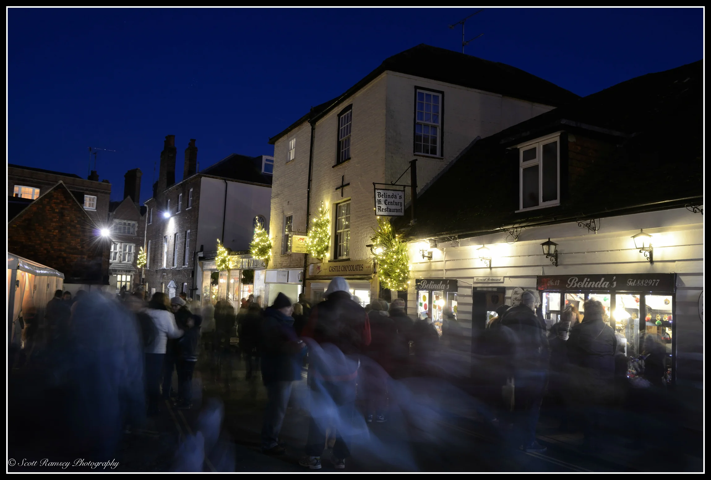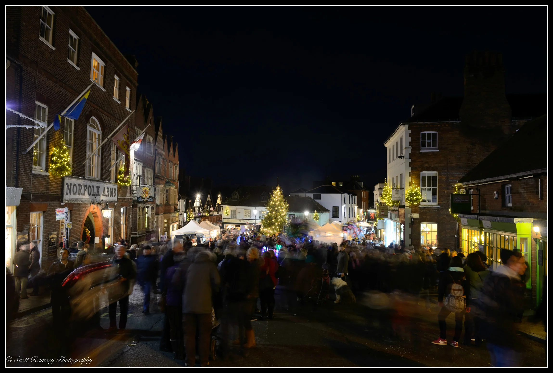 It was a cold and frosty December night, as I headed to the Arundel By Candlelight Christmas event to take some photographs. Arundel is a small market town famous for it's medieval castle, antique shops and historic buildings (Find out more about the historic town here). The River Arun runs through the town which is very popular with tourists and day trippers. Each year the Arundel Chamber of Commerce organises the Christmas event and supported by local traders the town centre is filled with Christmas lights, market stalls and thousands of visitors enjoying the festivities. This years event was no exception, and as I worked my way through the crowds of people who were enjoying mulled wine and listening to carol singers, I decided that I wanted to create a photo that captured this atmosphere. True enough a celebrity would be officially turning on the Christmas tree lights, however I wanted to show the town and historic buildings all lit up for Christmas. I really wanted to capture the atmosphere and so with the help of my son Max (who earlier had unknowingly volunteered to carry my tripod) I set up my camera amongst the people, shops and Christmas trees. Using a slow shutter speed and an ungloved hand I fired the shutter, not minding that the people walking by would become blurred in the photo. The blurring in fact added to the 'feel' of the photos, as it made them look like ghosts walking along the old cobbled streets.